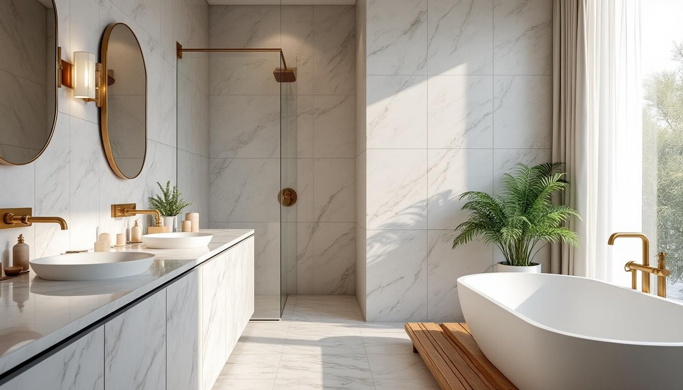- 🧼 Privilégiez un sol antidérapant en travertin brossé ou grès cérame Porcelanosa.